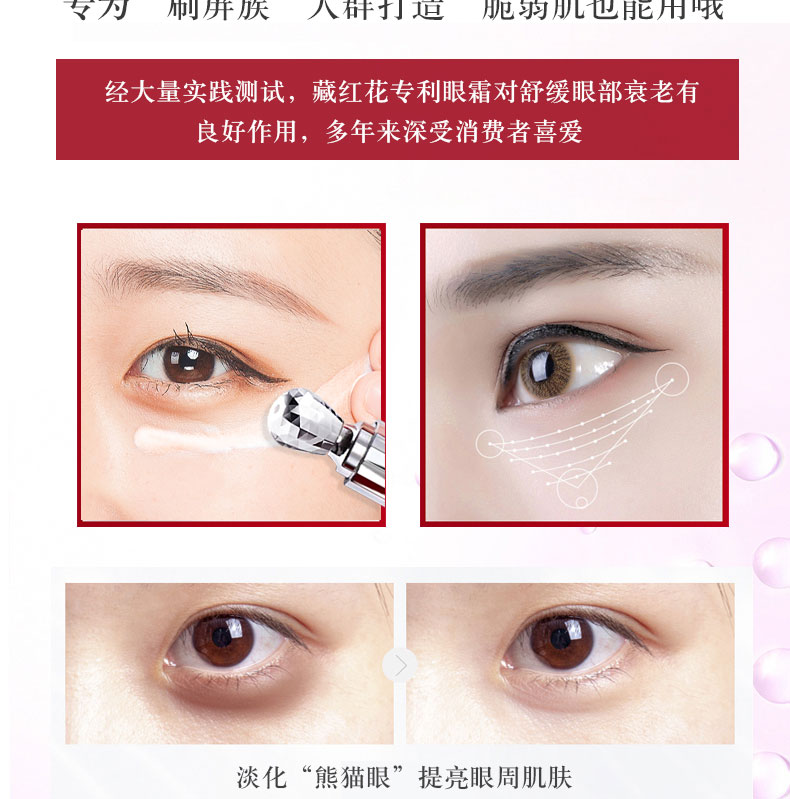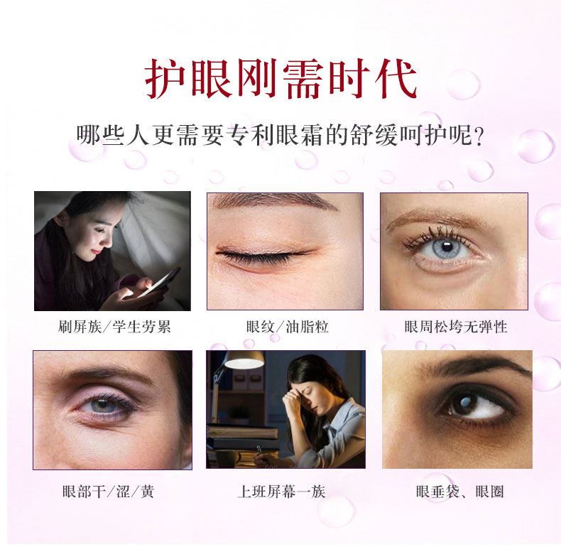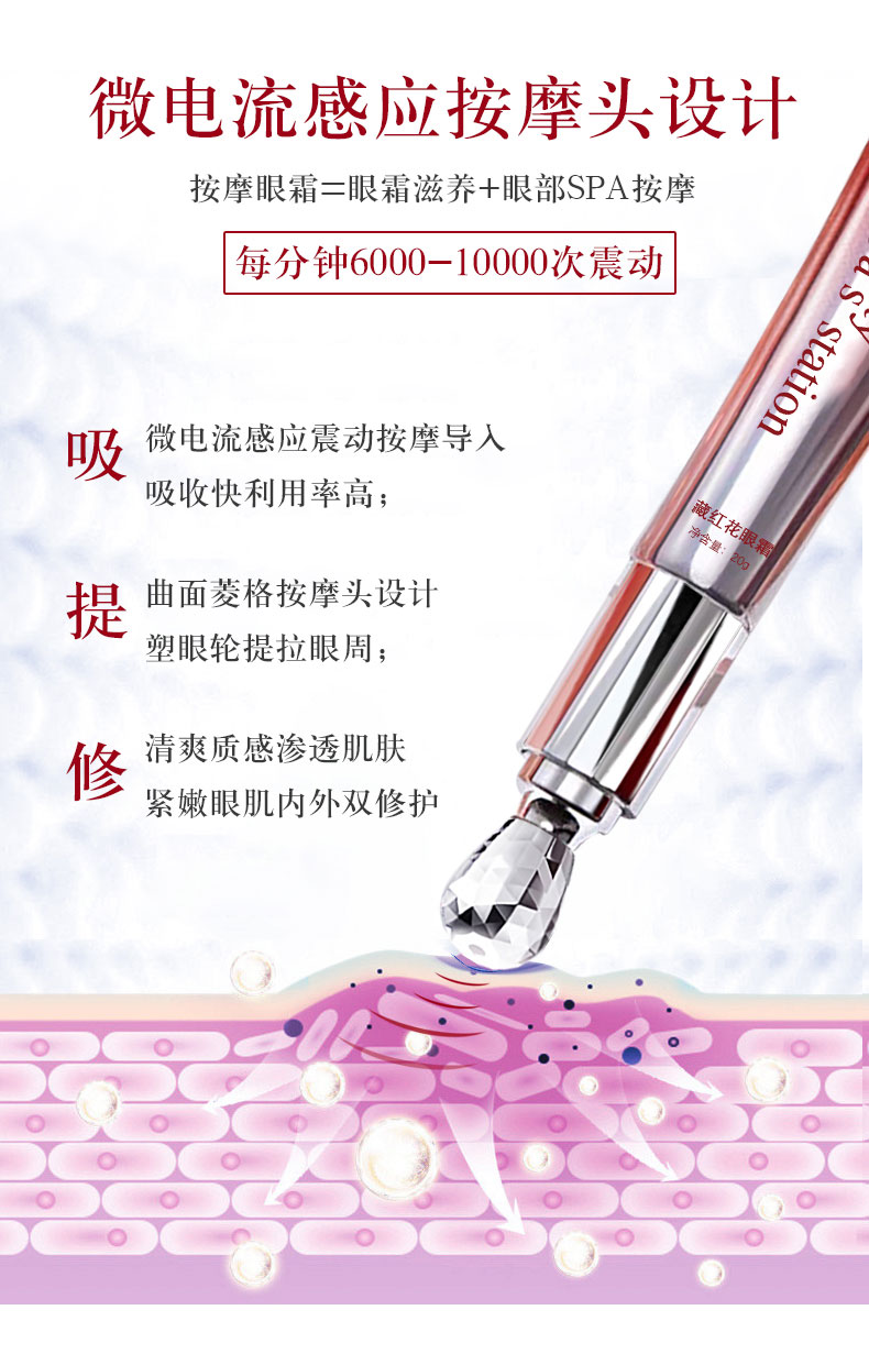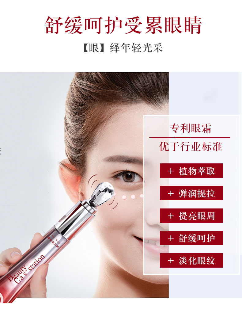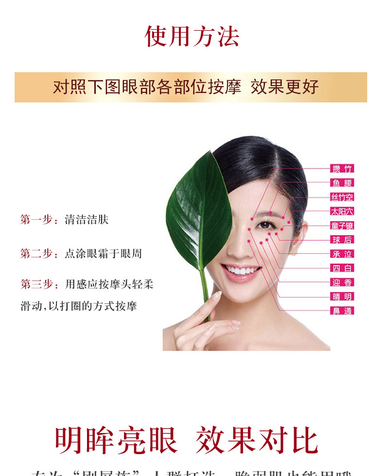 用法:潔膚后擠出適量產品于眼周,用感應按摩頭輕柔滑動,以打圈的方式分別于眼周肌膚上下轉動,再以指腹輕輕點按以促產品吸收。